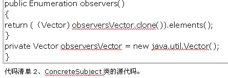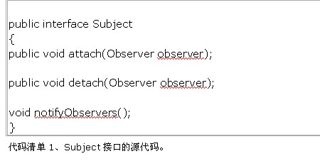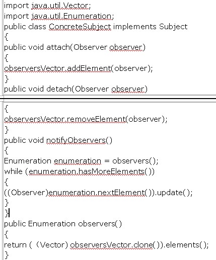 這個抽象主題接口規定出三個子類必須實現的操作,即 attach() 用來增加一個觀察者對象;detach() 用來刪除一個觀察者對象;和notifyObservers() 用來通知各個觀察者刷新它們自己。抽象主題角色實際上要求子類保持一個以所有的觀察者對象為元素的列表。