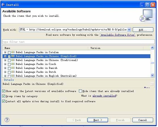 其中的Location設置為: http://download.eclipse.org/technology/babel/update-site/R0.9.0/indigo