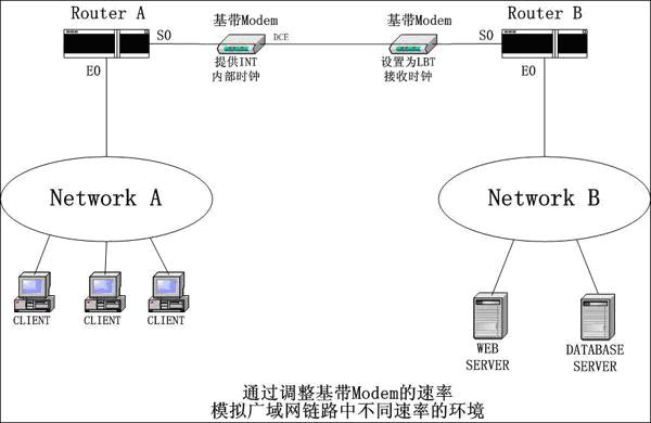 以上介紹的兩種方案都可以實現在本地局域網環境中構建不同速率的廣域網模擬環境。縱觀這兩種方案,第一種方案所搭建的模擬環境更加接近真實地廣域網環境。在廣域網環境中,通常是由電信運營商在局端的設備上設置時鐘頻率來限制用戶所使用的鏈路的帶寬。在第一種方案中,由于必須直連兩臺基帶Modem,而且需要手工連接Modem之間的線纜,以便調節它們之間的收發,因此配置的步驟可能會比較的繁瑣。另外,由于不同型號基帶Modem的速率轉換器在調整速率時通常會有一定范圍的限制。因此,在模擬環境中所能夠測試的鏈路帶寬會受到一定速率的限制。