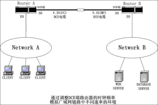 注意,由于V.35 DCE電纜連接著Router A,因此Router A將作為DCE端設備,由它來提供網絡中的時鐘頻率。所以,必須要在Router A上設置“clock rate”命令,并根據用戶的需求將時鐘頻率設置成相應的速率。在該例中,我們將測試的速率設置為64Kbps。