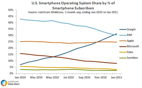 根據數據顯示,谷歌的Android系統馬上就要超過RIM的BlackBerry成為美國市場占有率最大的智能手機操作系統。緊隨其后的將是RIM公司的BlackBerry和蘋果公司的iOS操作系統。而微軟公司的WM和WP7操作系統市場份額還會繼續下降。