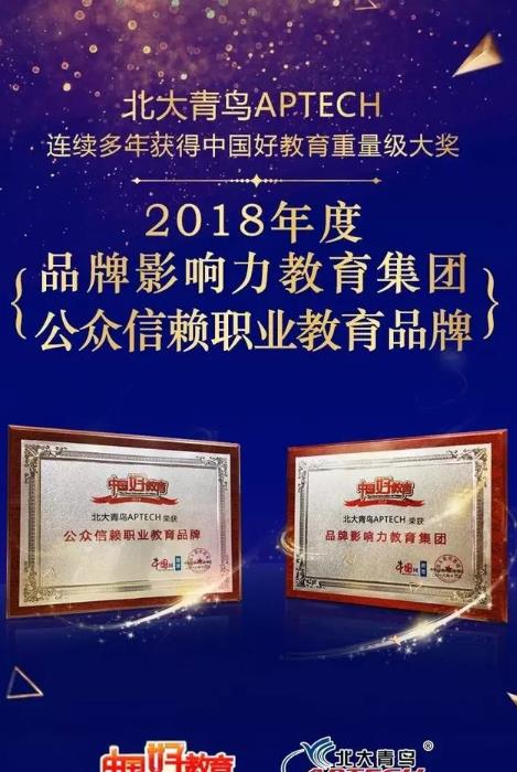 2018年12月12日,由中國互聯網新聞中心(中國網)主辦、中國網教育頻道承辦的“扛歷史使命、塑時代新人”第七屆中國教育家年會暨中國好教育盛典在北京釣魚臺國賓館芳菲苑召開。中國IT職業教育領導品牌北大青鳥APTECH受邀參會,與來自全國各地的教育界官員、專家學者、校長、老師、教育培訓機構代表齊聚一堂,共同探討未來教育事業發展之路。在中國好教育頒獎盛典上,北大青鳥APTECH憑借在IT教育領域執著奮進19載取得的輝煌成績和貢獻,斬獲“2018年度品牌影響力教育集團”“2018年度公眾信賴職業教育品牌”雙項大獎。