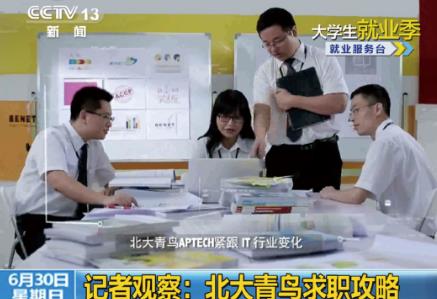 2013年6月,中央電視臺新聞頻道《朝聞天下》與財經頻道《第一時間》欄目,在大學生就業季,對北大青鳥APTECH通過注重實戰能力培養,幫助大學生成功高薪就業進行了深度報道。