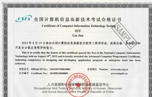 國家勞動(dòng)和社會(huì)保障部職業(yè)技能鑒定中心認(rèn)證——軟件工程師