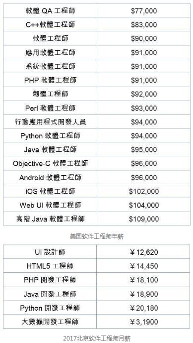 按類別:據(jù)Indeed.com公布的數(shù)據(jù),高級Java軟件工程師年薪最高,達(dá)109000美元;其次是Web UI工程師,104000美元;iOS軟件工程師年薪也在100000美元以上。