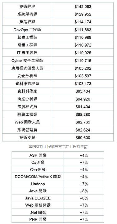 以美國為例,年薪從高到低,前10名依次是技術(shù)經(jīng)理、系統(tǒng)架構(gòu)師、產(chǎn)品經(jīng)理、DevOps工程師、軟件工程師、硬件工程師、IT項(xiàng)目經(jīng)理、Cyber安全工程師、應(yīng)用程序開發(fā)人員和安全分析師。