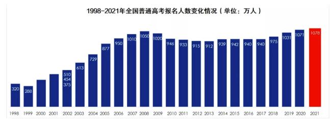 根據(jù)官方的數(shù)據(jù)顯示,2021年全國高考報考人數(shù)規(guī)模高達1078萬人,創(chuàng)造了中國自1977年高考重啟以來的歷史最高人數(shù)紀錄。而且這已經(jīng)是連續(xù)三年高考人數(shù)超過1000萬:2019年1031萬,2020年1071萬,2021年1078萬。