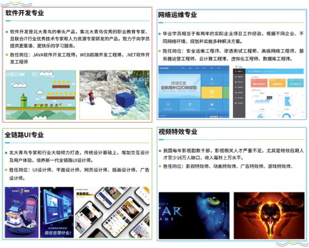 現在,各地的中職學校都有與北大青鳥職業教育合作開設“計算機特色專業”班級的,不僅是因為北大青鳥職業教育擁有23年的培養IT行業技能人才的成功經驗,而且能進入計算機專業班的學生都有較好的邏輯思維能力,通過青鳥的標準化教學模式的管理下,都將在專業領域學得IT互聯網行業所亟需的技能和知識,三年的學習后,有可以升學的知識能力,也有可以就業的一技之長。目前招生的班型如下,滿足入學條件的初中畢業生可以就近入學,或是撥打下方咨詢電話,會有專業的學習規劃師答疑解惑。